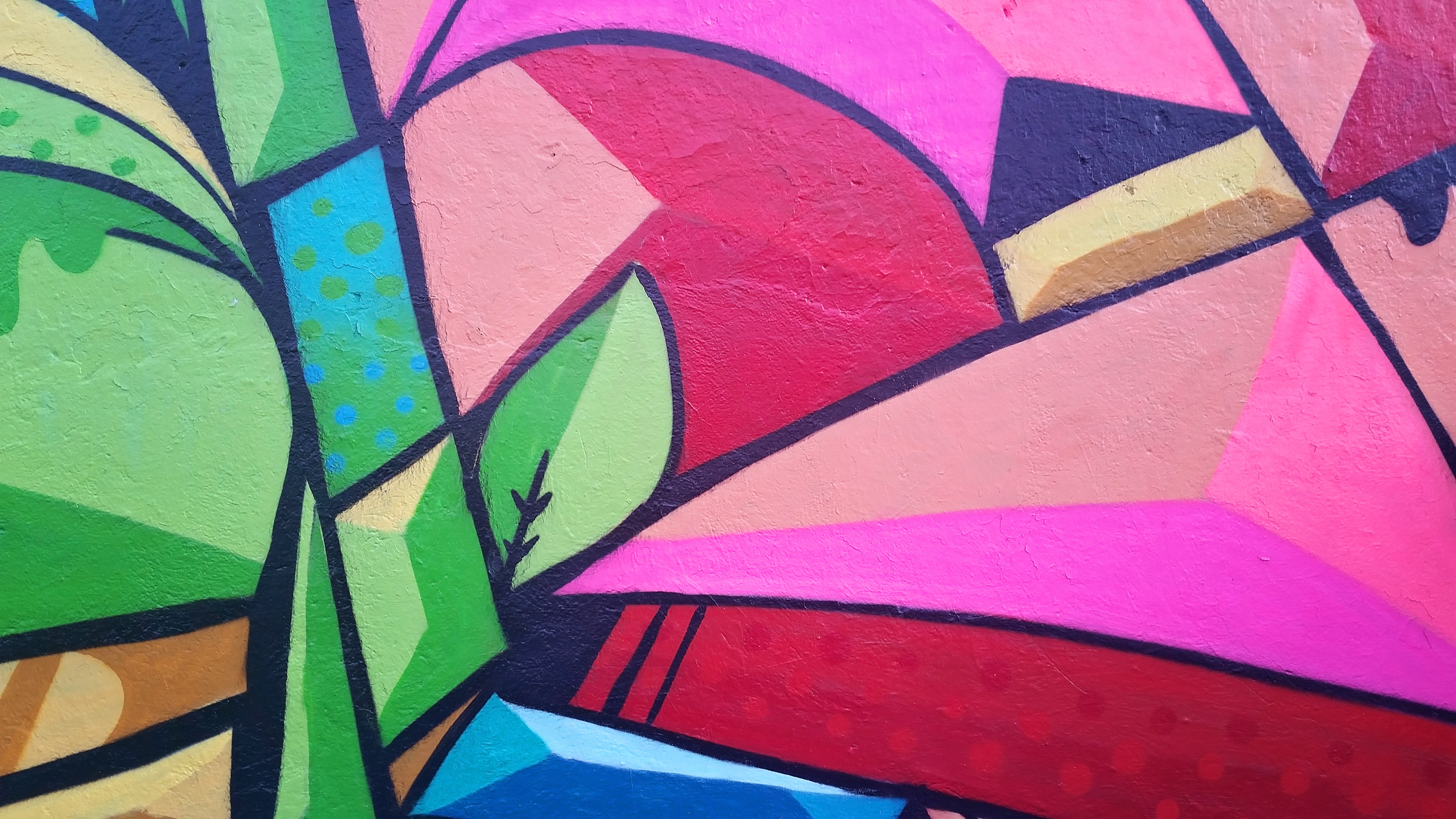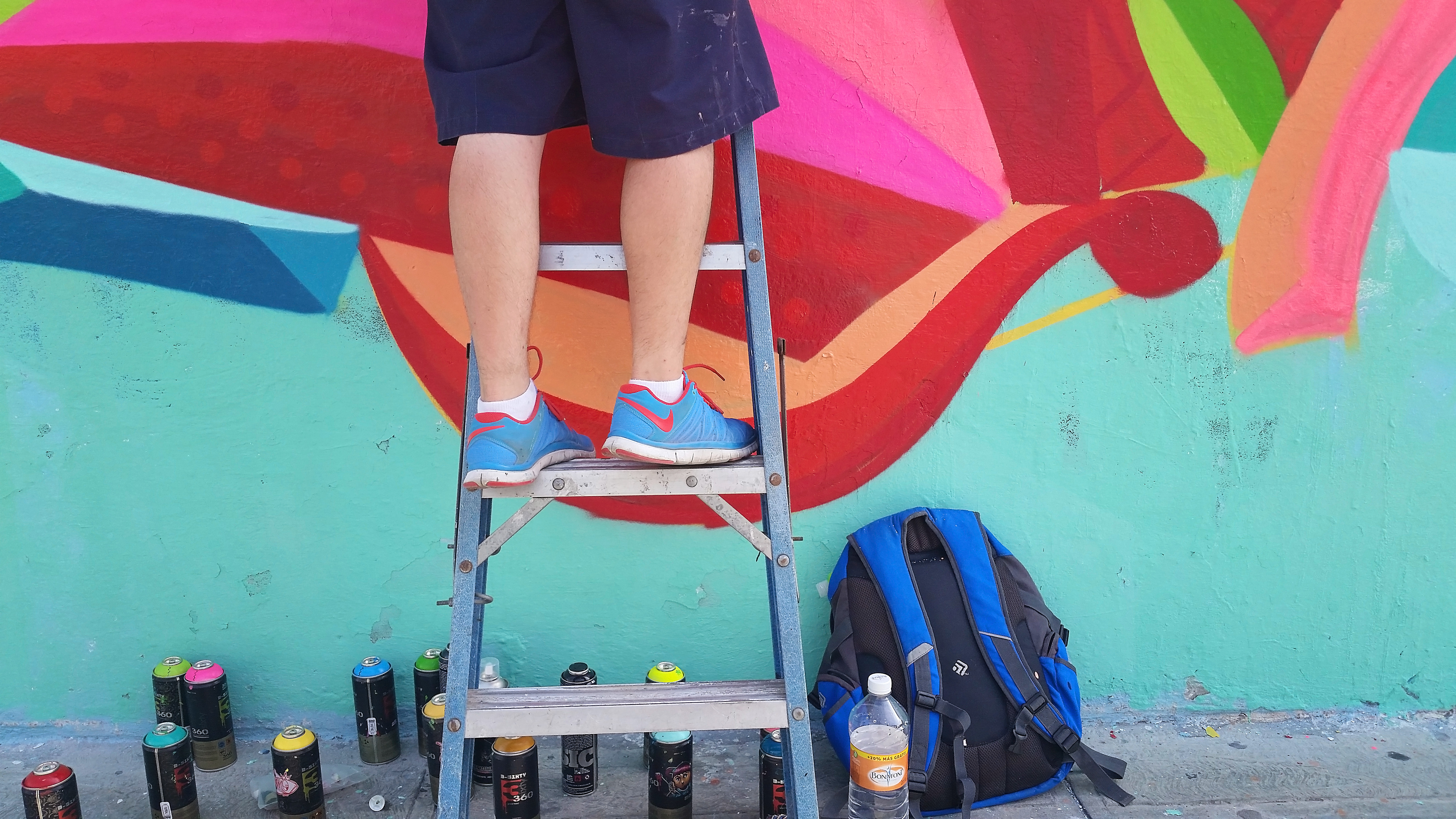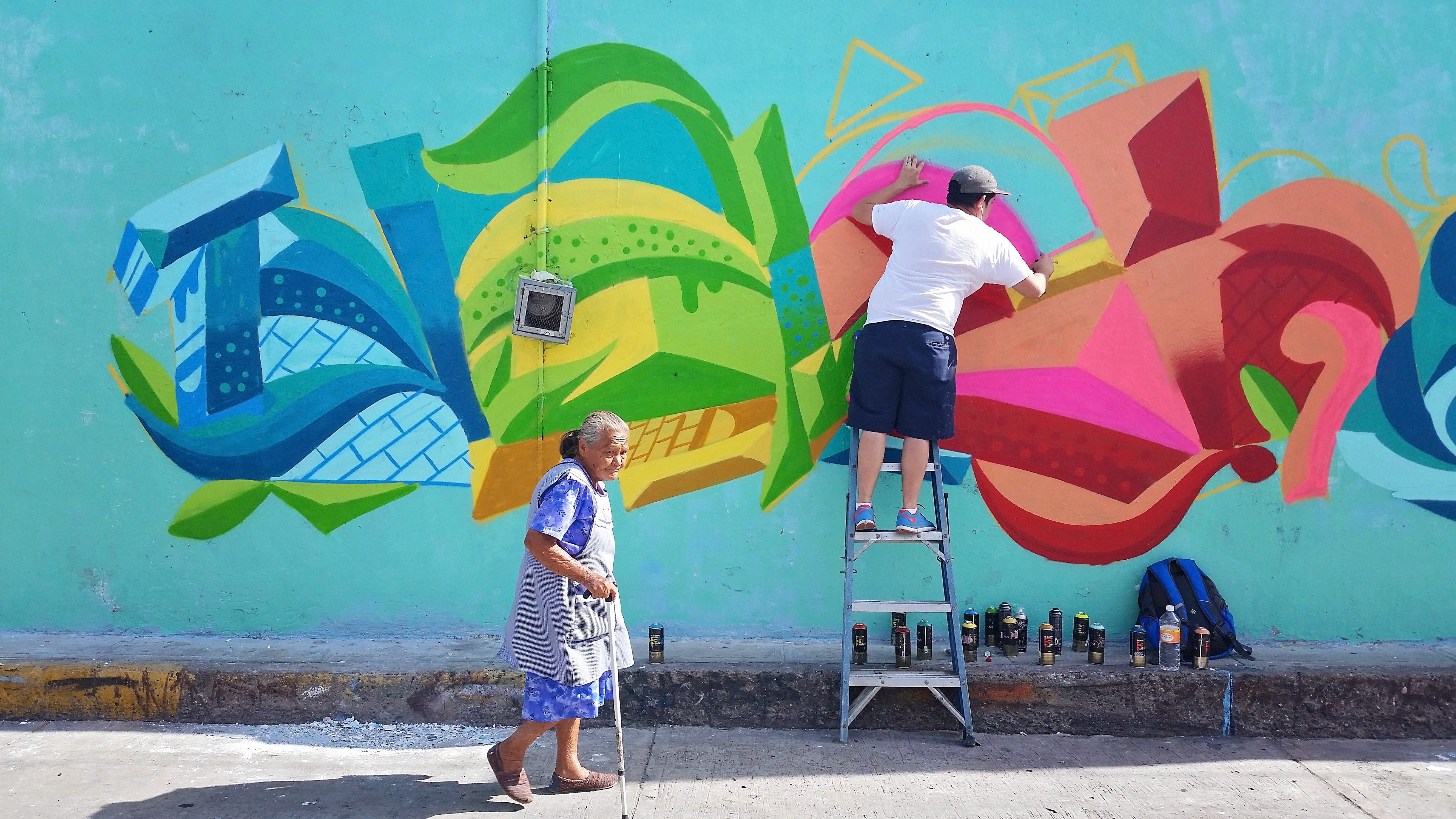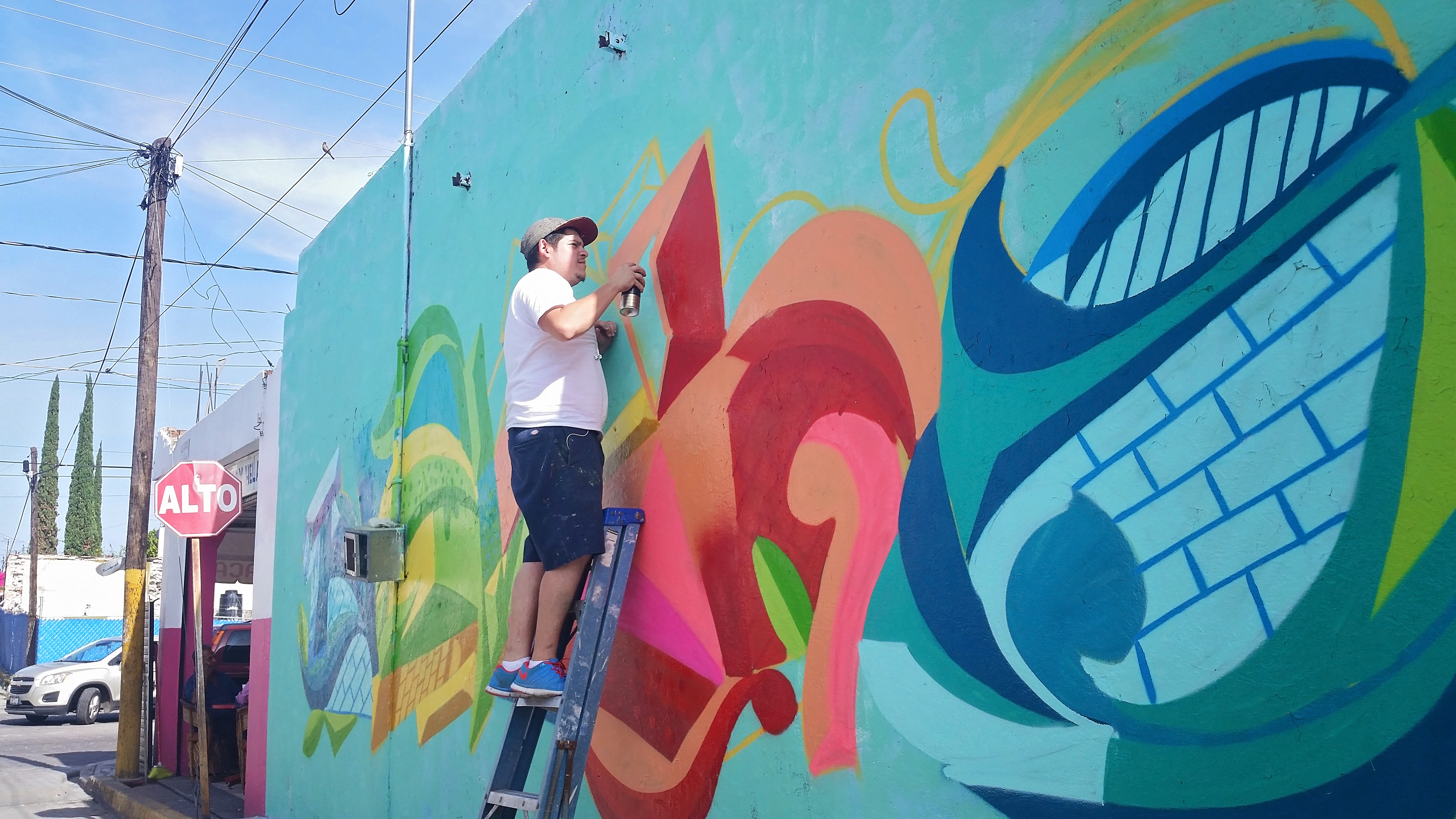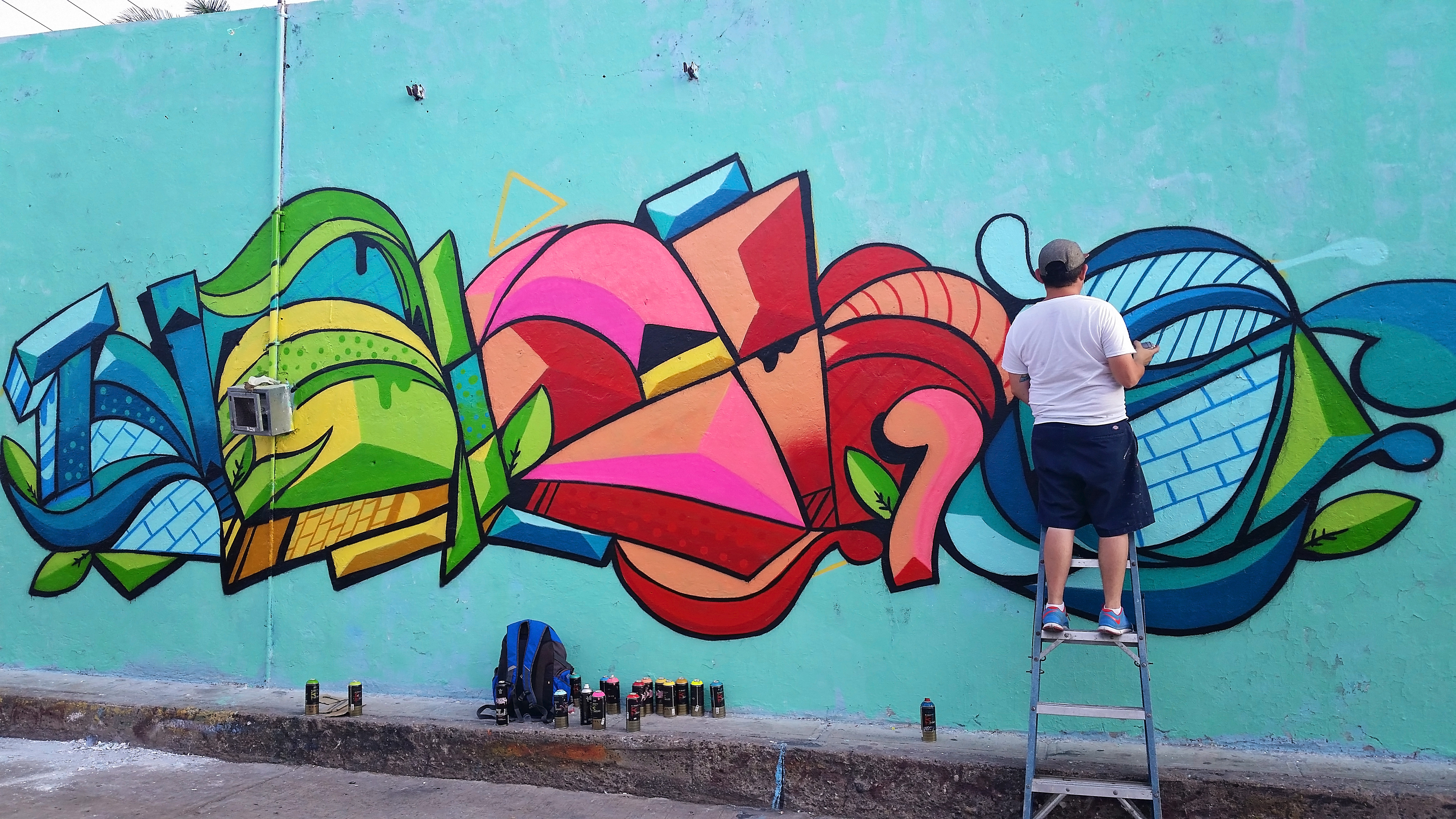 Next morning I had to borrow my cousins truck in order to transport buff and a latter to be able to complete the mural. My lady and I arrived around 11am and began right away with the scraping and buffing of the wall. The heat at that time of day was no Joke!!!- I continued painting for about 3 and a half hours until we decided to take a little lunch break. By that time I was exhausted by the heat and hungry!. I finished lunch and headed back to the wall, by that time we had brought back some company (family) to hang out and watch. I painted for about 4 more hours until the mural was finally completed. Through out my project many people stopped by to talk to me. I had alot of positive feedback from the communtiy, i even had a little old lady stop by and “congratulate me” she went on to say thank you and that it brought a lot of joy to her because of the bright colors. Someone even said it was very “elegant”, which was an odd word to describe graffiti, but I appreciated it!