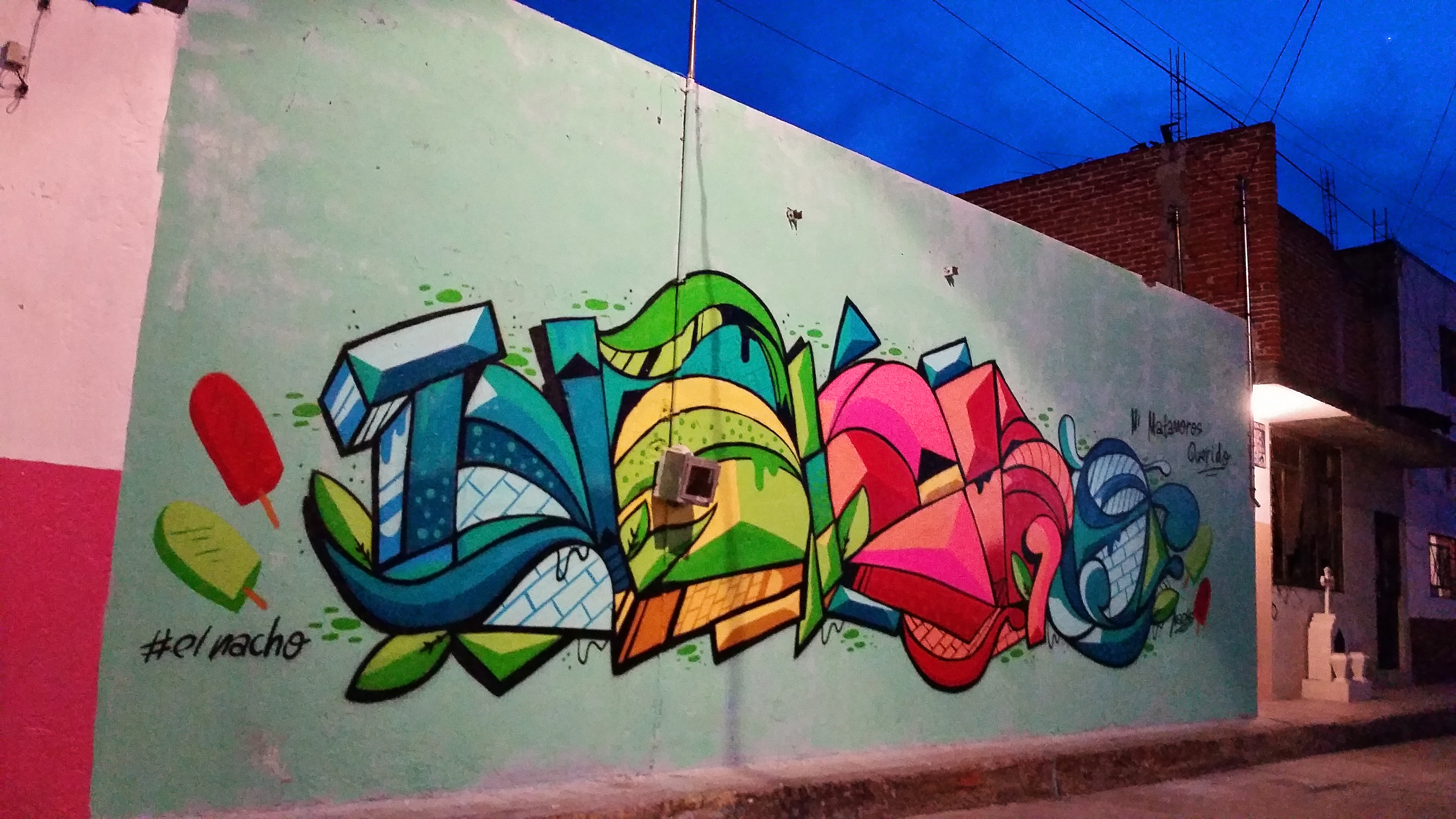 Also I didn’t want to sit and wait for something to come up. I new that I had to get up off my feet and do something so I did. Me and my lady put on our running shoes and jogged the little town while looking around for some possibilites. We figured  someone was bound to let me paint. One after the other they kept turning me down. Finally we ran into a little ice cream shop that had some old graff that was faded and pealing. It was a rather huge wall, and kind of doubted myself. But I said what the heck its worth a shot. So we stopped and asked. The gentlemen was very humble and had his daughter there with him. As soon as I began to show previous pictures of my older work from back home he seemed up for it. We were so excited we left without paying the for the coffee flavored ice cream we bought! So we ran back to pay the man. He mentioned not to worry about because he would see us first thing in the morning.