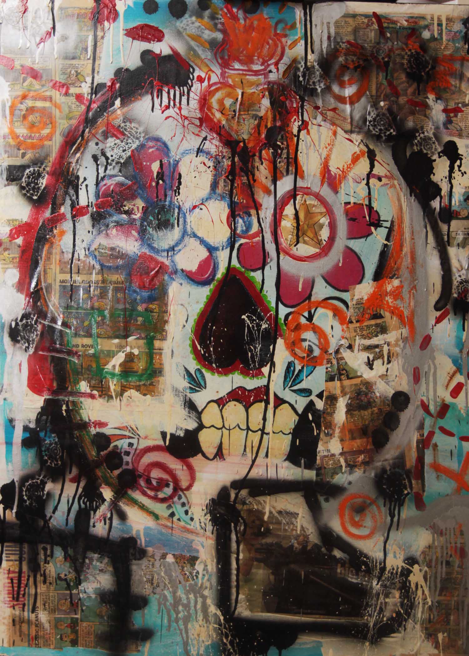 Previous Image Next Image Calavera no llora 30×40 canvas Medium- Acrylics/Oil Bars/Spray Paint/Newspaper